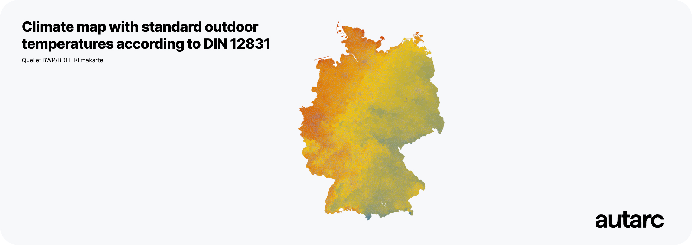 The standard outdoor temperature indicates how cold it can get at a location in winter. It is used to calculate the maximum heat loss. According to standards, standard outdoor temperatures differ depending on the region in Germany. A location in the Alps, for example, has a significantly lower standard temperature than a town in the Rhineland. These climatic differences have a direct effect on the heat loss.