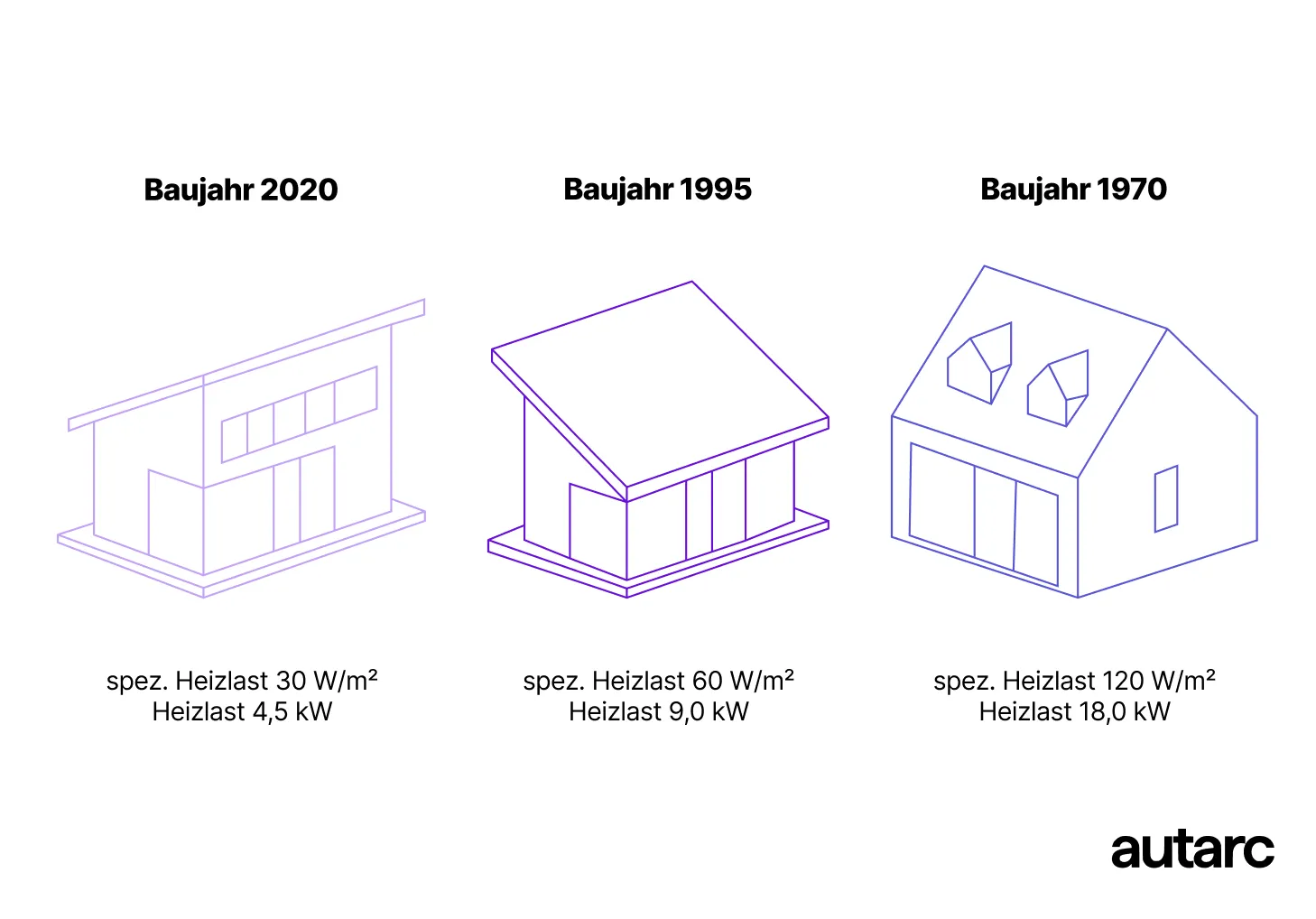Heizlast (in Watt) = Wohnfläche (in m²) X spez. Wärmebedarf (in W/m²)