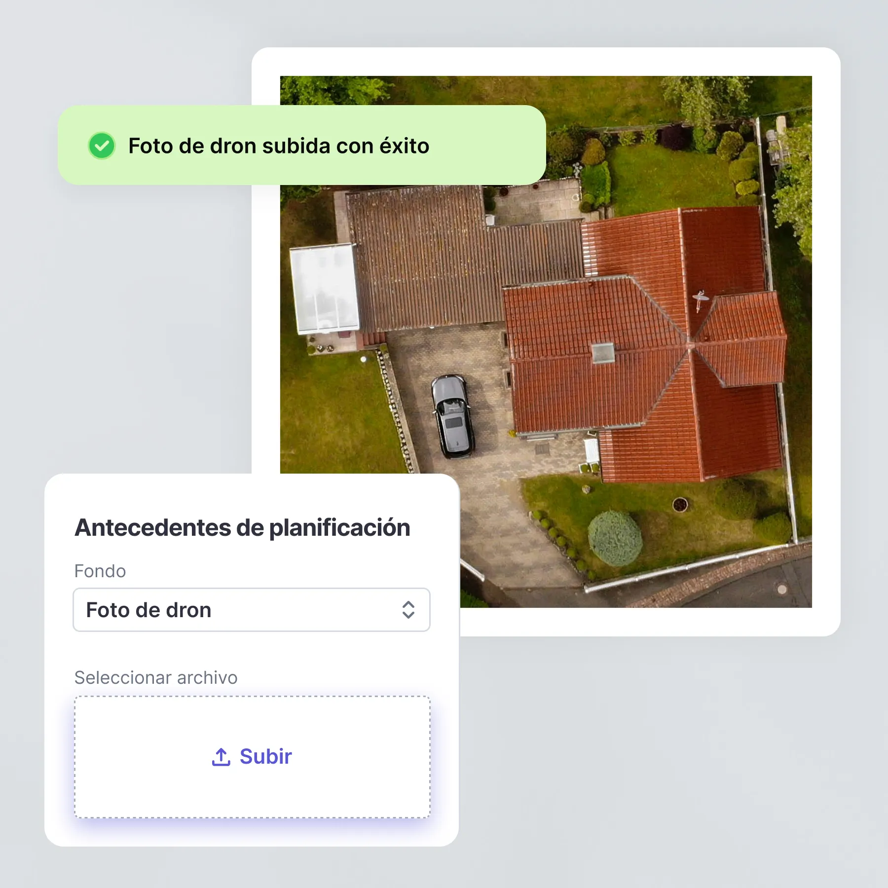 Pueden subir sus propias fotos de drones directamente. El sistema las procesa automáticamente para la planificación.