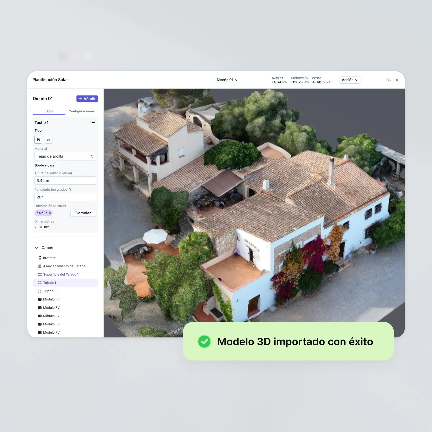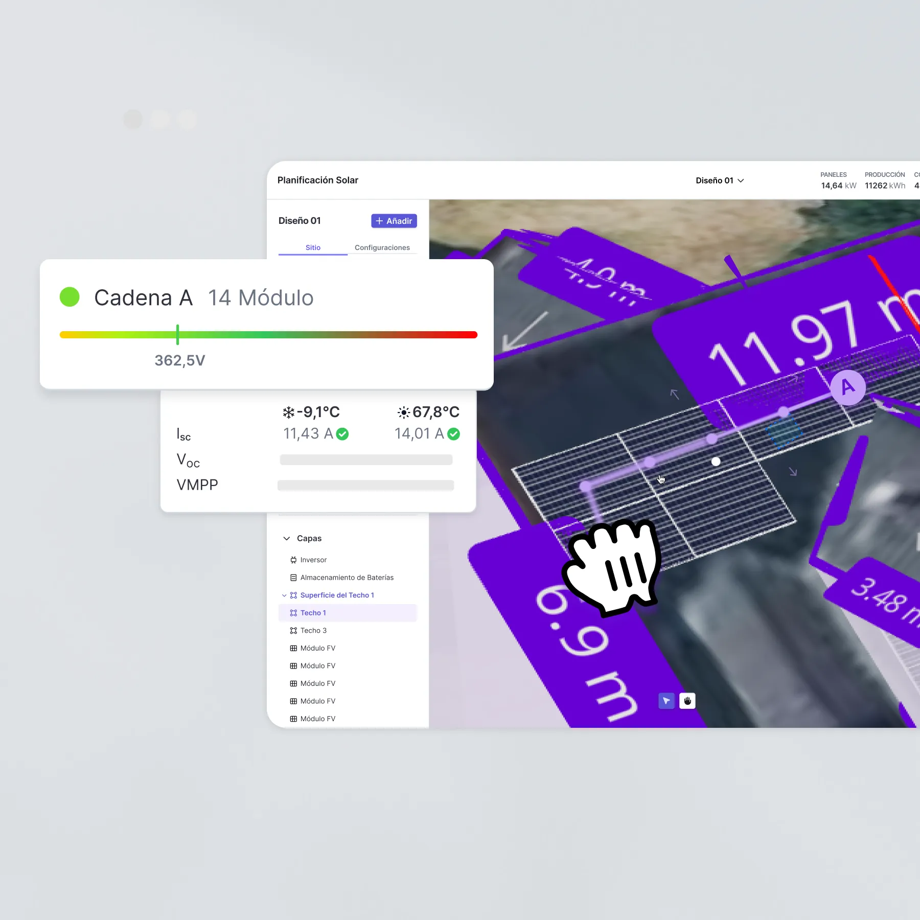 La asignación de módulos y la planificación de cadenas se planifican directamente en el modelo 3D. Cada detalle del techo se registra con una precisión centimétrica y se puede planificar.