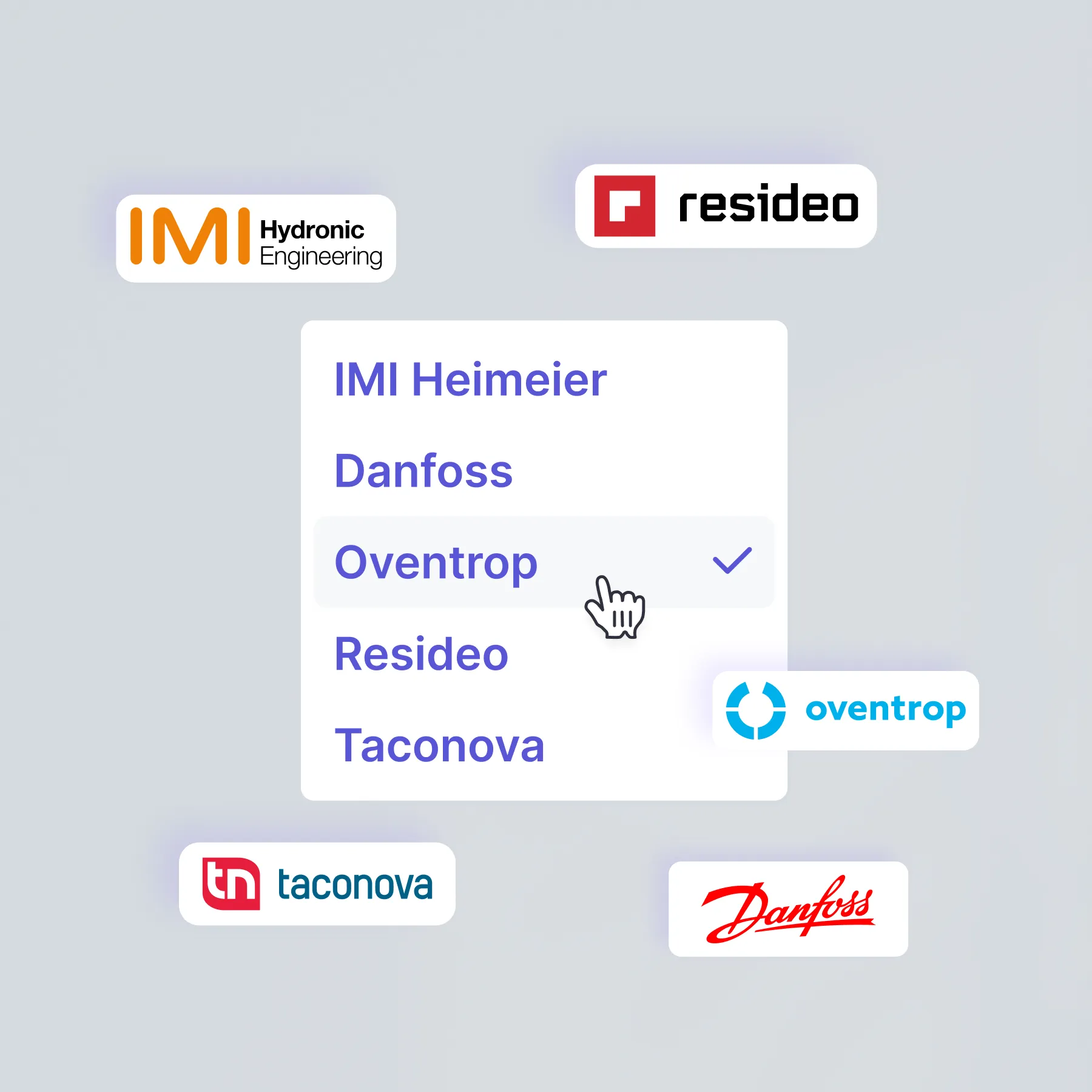 - Szeroka gama zaworów: W bazie danych znajduje się ponad 500 modeli zaworów wiodących producentów takich jak Danfoss, Honeywell i Oventrop.
