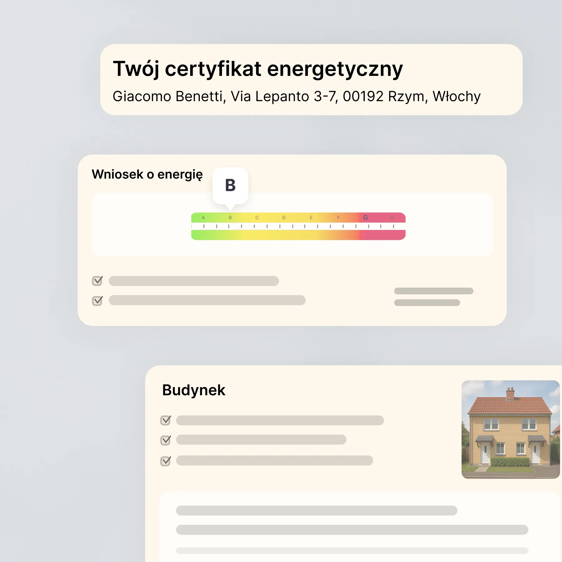 W przypadku autarc Twój certyfikat energetyczny jest już ważny Gotowy za kilka dni. Nasze zautomatyzowane procesy i certyfikowani konsultanci energetyczni zapewniają szybkie przetwarzanie bez utraty jakości.